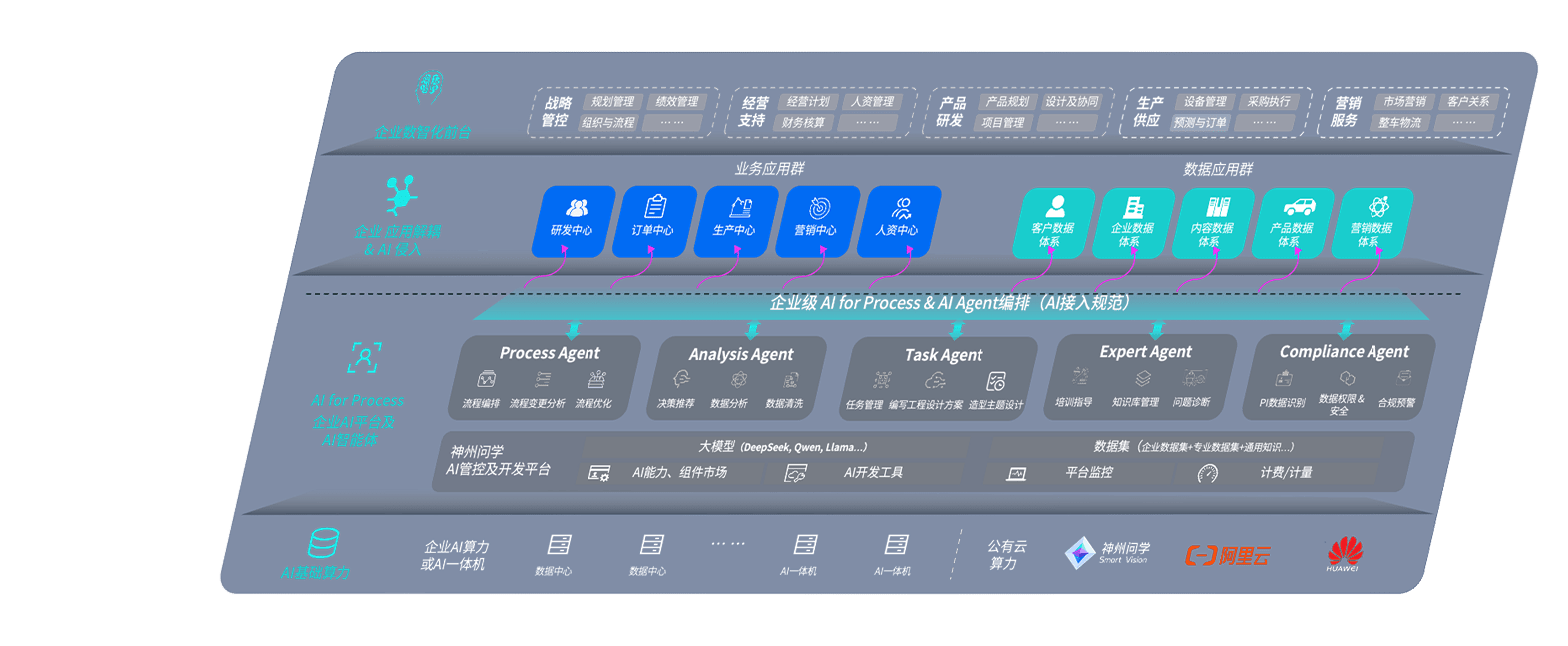 端到端的一站式AI工作空间深度融合了从企业战略规划到日常经营的全流程业务板块,,定向解决车企内部领域多、、、、部门多、、链条长、、、场景碎片化等难题,,,,支持车企快速构建以AI为核心的生产力写作体系,,,,实现任务执行与AI能力的无缝集成与交互