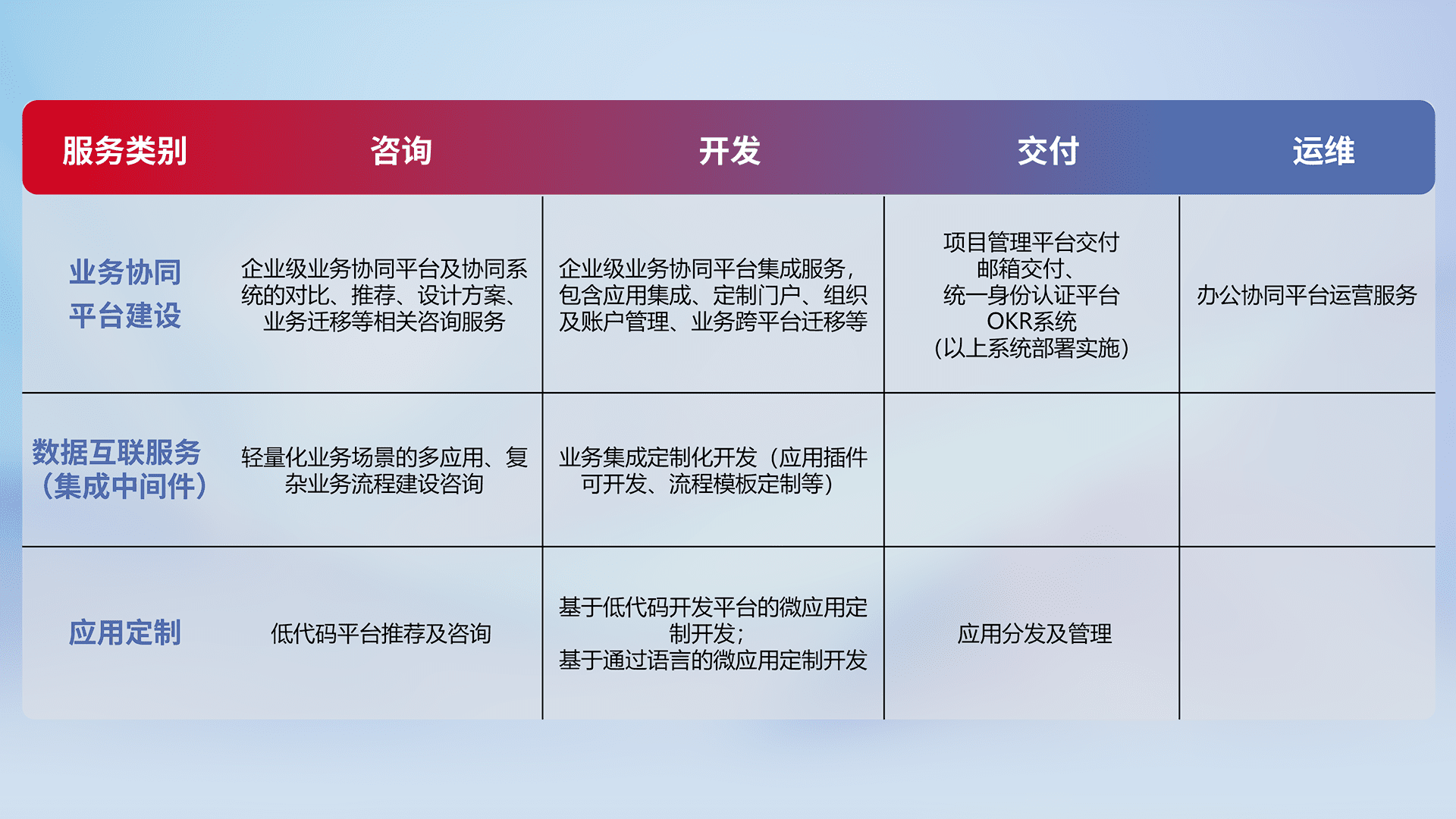 针对钉钉、、、企微、、、IDaas等平台级产品提供产品的规划、、、、方案、、、交付、、定制化开发等服务,,实现如统一协同办公、、智能客户服务、、、、混合会议管理、、、、智能数据查询、、等业务场景,,实现数字化转型。。