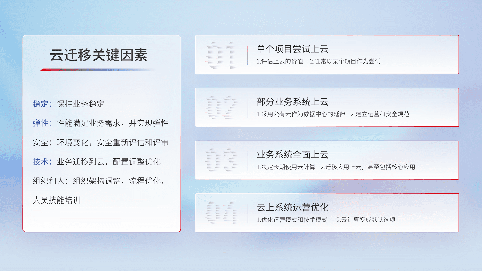 结合实际业务,,,从规划设计、、云平台选型、、、、云原生改造、、数据迁移、、集成交付,,,,迁移全过程为客户识别最佳上云路径,,,,做好风险识别管理,,设计网络架构、、、、身份权限、、、安全审计合规、、操作审计、、、日志审计、、监控告警策略、、、、多站点容灾设计等,,,,对云上基础设施进行整体规划,,,,提升IT治理水平,,以满足弹性、、高可用、、、高性能的需求。。。。