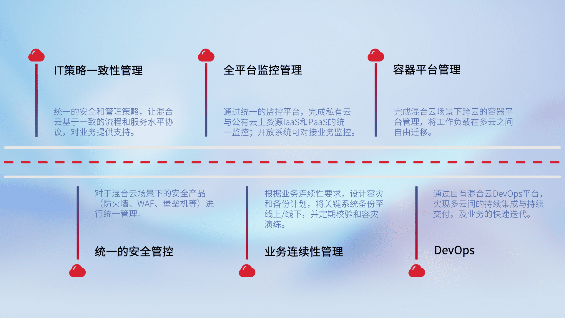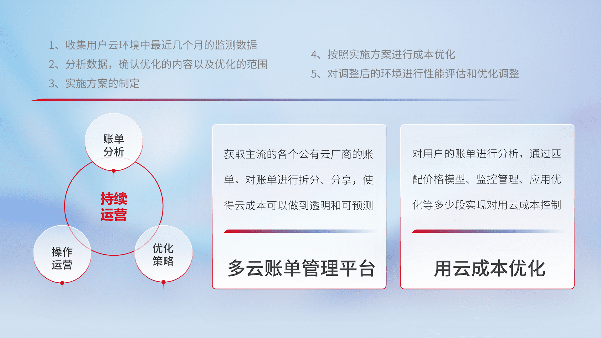 通过多云纳管,,,以统一的资源数据模型把客户的云资源进行抽象和封装,,,,进而实现对多云资源的统一操作,,,,保障云资源管理的可靠性、、稳定性与可用性。。。。量身定制化运维内容,,,配置、、、开发运维、、、、补丁管理、、备份、、监控、、认证和访问管理、、、、审计和日常巡检等,,保障在用云过程中的可靠度,,,稳定度以及高可用率。。